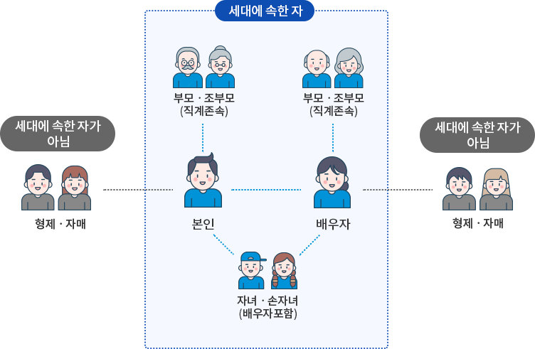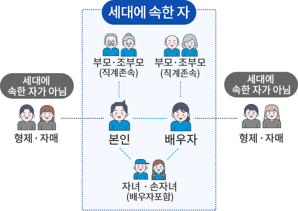 세대에 속한 자는 본인의 부모,조부모(직계존속), 배우자의 부모,조부모(직계존속), 자녀, 손자녀(배우자포함)이며 본인의 형제,자매 또는 배우자의 형제,자매는 세대에 속한 자가 아님. 동일한 주민등록표등본에 함께 등재된 배우자의 직계존속과 직계비속의 배우자도 국민 또는 민영주택에 관계없이 세대에 포함됩니다. 청약자의 세대에 속한 자가 아닌분 - 형제, 자매, 동거인등.
